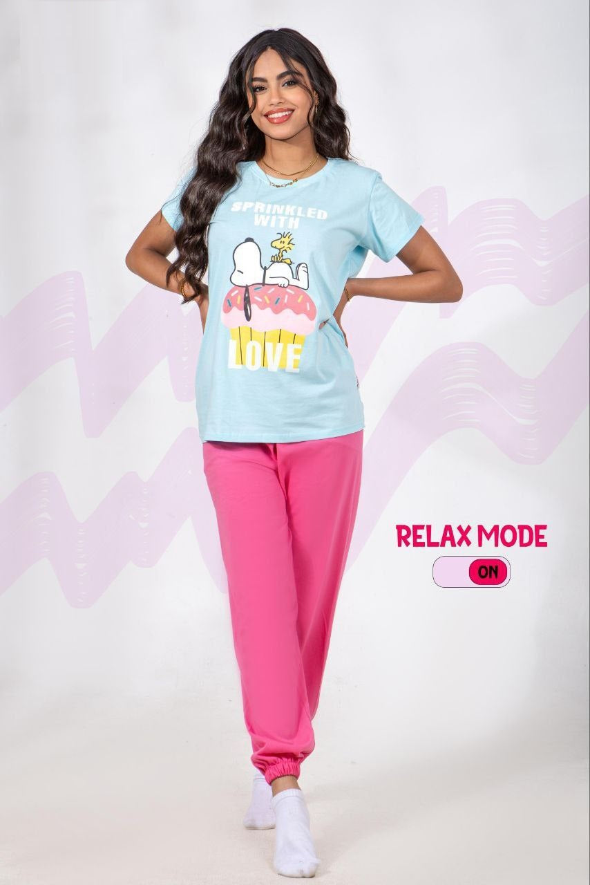 بيجاما نسائية قطنية من مجموعة ZumBa لصيف 2025، بلوزة زرقاء برسمة سنوبي على قطعة دونات مع عبارة "Sprinkled with Love".