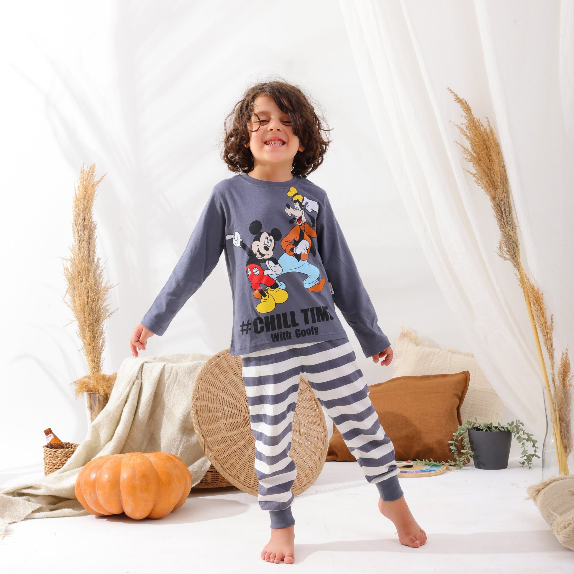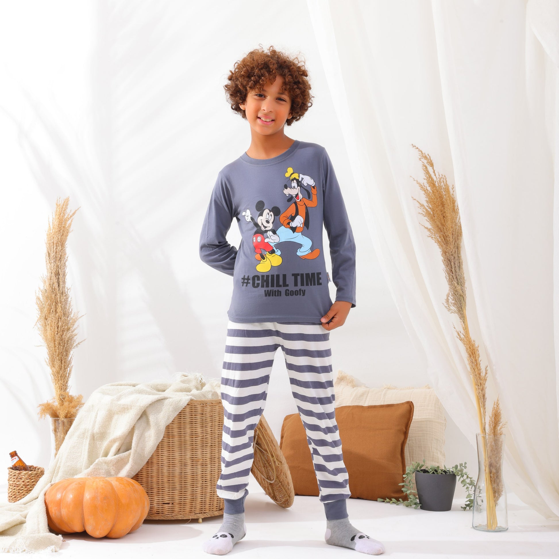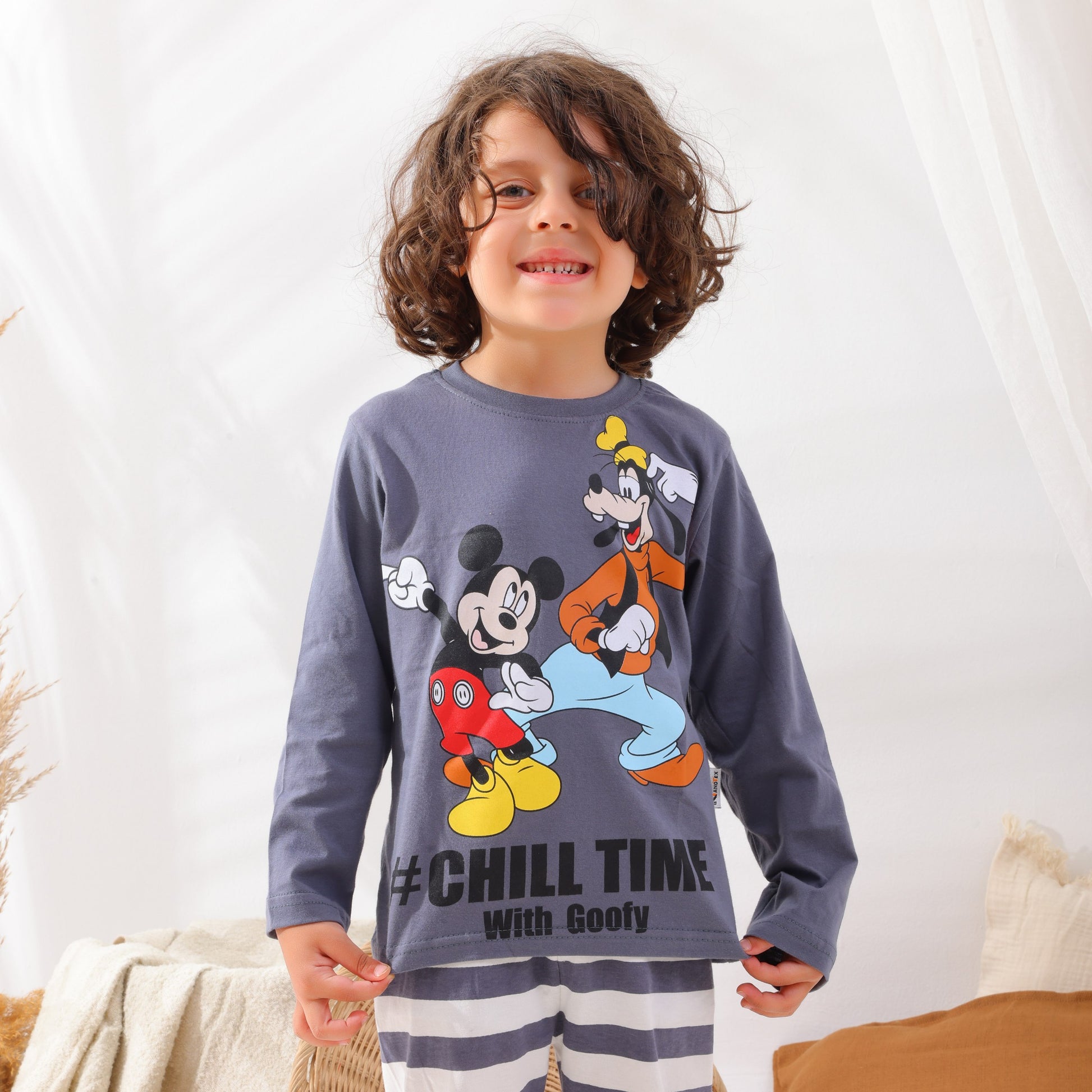 • بيجامة ولادي قطني عالي الجودة، زينة بطبعة شخصية ميكي ماوس وجوفي مع عبارة مكتوبة "#Chill Time with Goofy" بجودة عالية للتشققات والبهتان.