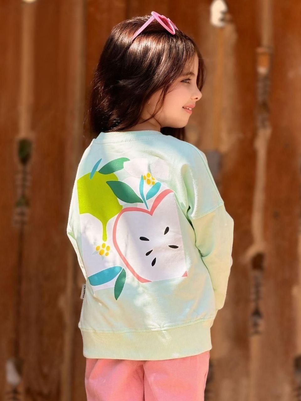 • طقم بناتي بخامة سمر ميلتون مميز، يتميز بجاكيت بلون بيج مزين برسمة زرافة مرحة وأكمام مزخرفة بنقشة جلد زرافة مع كلمة "Happy Mood" مطبوعة بجودة عالية.